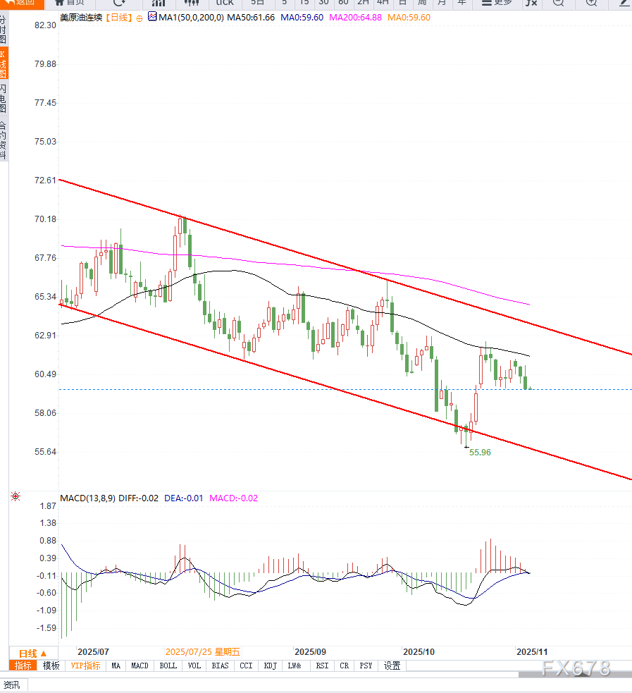 库存的突然增加主要来自于原油进口量上升,使得供应回升速度快于需求节奏。   机构观点:库存激增反映供应快速回归,短期内将继续压制油价上涨空间。   尽管供应端累库明显,但终端消费端的表现仍具有一定韧性。   报告中显示,汽油库存下降 470万桶,馏分油库存下降 64.3万桶,均已连续第五周下降,表明终端需求仍然稳健。然而,由于累库幅度过大,使得需求端的利好被掩盖,投资者情绪偏向悲观。   在库存数据公布后,油价在盘中迅速走弱,能源分析师指出,本次库存增加“抵消了上一周下降带来的利多信号,市场对油价前景更加谨慎”。   从日线图形分析来看,WTI原油连跌多日,价格已跌至59.50美元关键支撑带附近。从结构上看,K线跌破短期均线组合(MA10 与 MA20),且 MACD 指标死叉继续扩大动能,显示空头占据主导。   RSI 指标目前运行在弱势区间,尚未出现明显背离信号,说明多头尚未形成有效反击。从技术面结构可以看出,若油价继续跌破59美元关键支撑,下方可能打开至58美元甚至56.8美元的空间;   只有当价格重新回到 61.50美元以上,多头才有可能扭转下跌趋势。