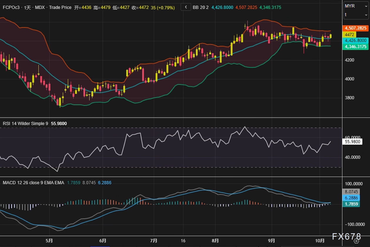周二(10月7日),马来西亚棕榈油期货结束两日连跌,主力合约FCPOc3收报4472林吉特/吨,单日上涨35林吉特,涨幅0.79%。技术面上,布林带上轨位于4507林吉特附近,MACD柱状线收于6.29,快慢线呈多头排列,显示短期动能转向积极。