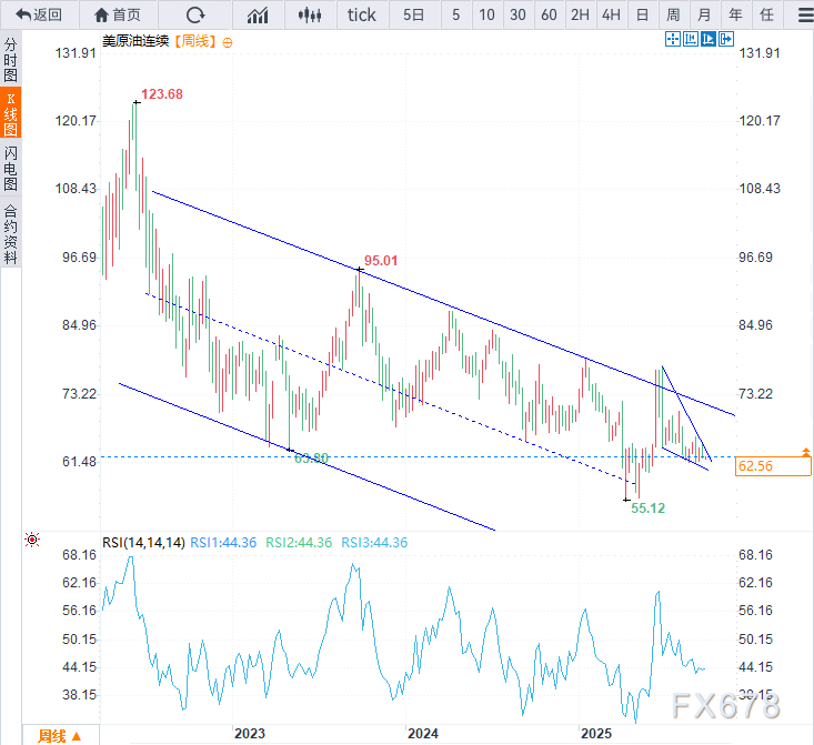 原油整体盘整格局,但仍维持看跌倾向,相对强弱指数(RSI)持续位于50中性水平下方,且价格走势始终运行在2022年高点延伸而来的三年下降通道内部。